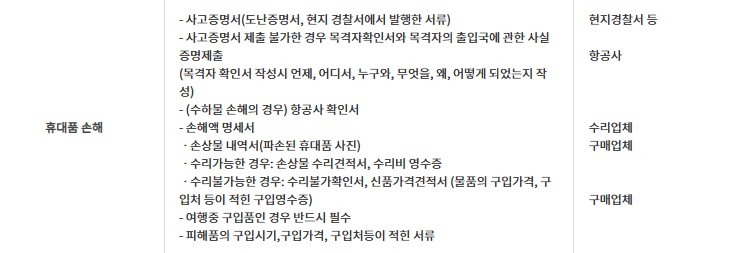 | 필요 서류 | 파손 사진, 수리 영수증 또는 수리불가확인서, 경찰신고서(도난 시) |
